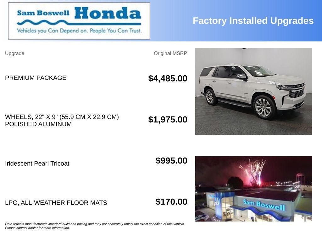 Powered by a robust V8 engine paired with a smooth automatic transmission, the 2021 Chevrolet Tahoe Premier provides strong horsepower, confident acceleration, and outstanding towing capability for boats, trailers, and campers. Available four-wheel drive enhances traction and control, while advanced driver-assist features include adaptive cruise control, blind spot monitoring, lane keep assist, rear cross traffic alert, forward collision warning, and a high-definition rearview camera. Inside, you’ll find a refined interior with leather seating, heated and ventilated front seats, navigation, Apple CarPlay, Android Auto, Bluetooth® connectivity, and a premium infotainment system, making this full-size SUV perfect for road trips, daily driving, and family adventures. Visit Sam Boswell Honda today to test drive the 2021 Chevrolet Tahoe Premier and experience the perfect combination of power, luxury, and advanced technology ⭐🚘