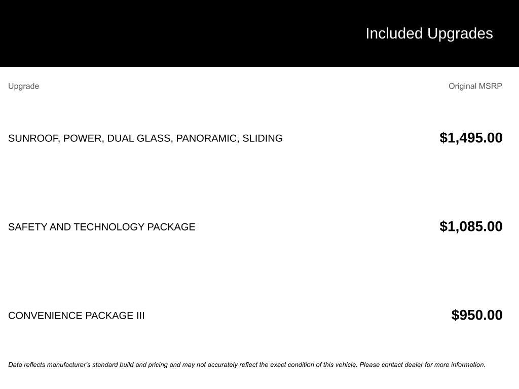 - Convenience Package II Includes (A2X) 8-way power driver seat adjuster, (AL9) 2-way power driver seat adjuster, (ASV) cabin humidity and windshield sensor, (CE1) Rainsense intermittent front wipers, (CJ2) dual-zone automatic climate control, (CMO) Heated Wiper Park, (K4C) Wireless Charging, (TCP) AutoSense, hands-free power programmable liftgate, (UG1) Universal Home Remote, (VK8) sunglass holder and (V2P) roof rails (Beginning with start of production, certain vehicles will be forced to include (R6I) Universal Home Remote Non-functional, which removes Universal Home Remote. See dealer for details or the window label for the features on a specific vehicle.)